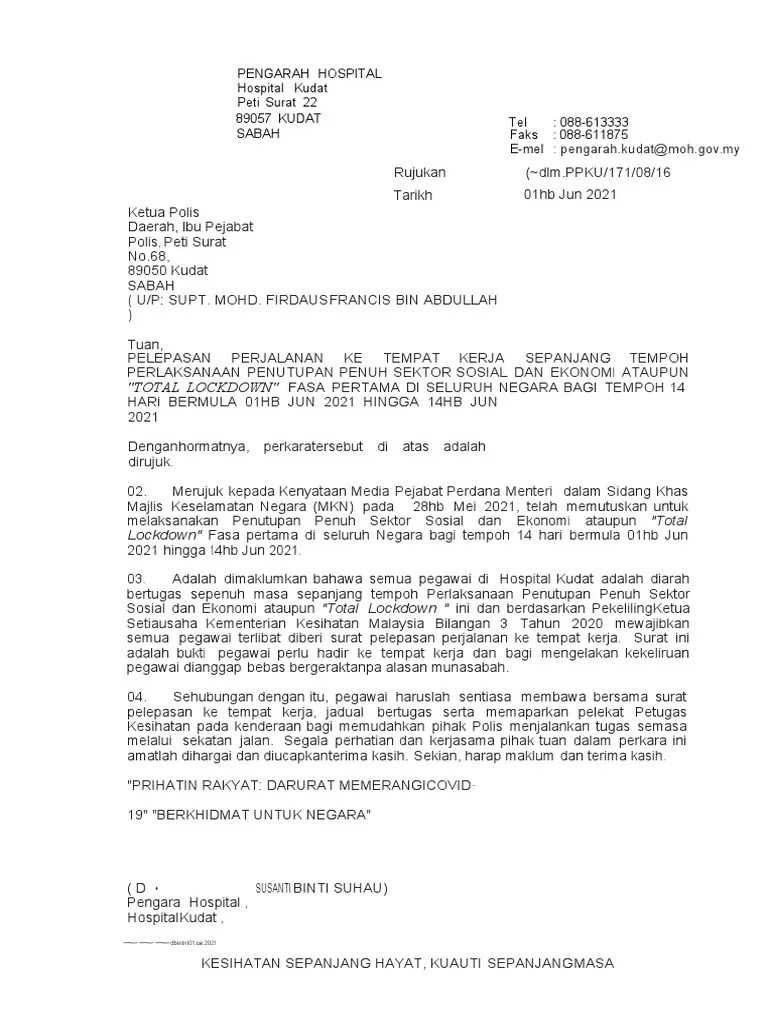 Surat pelepasan bekerja semasa tempoh pkp/pkpb.